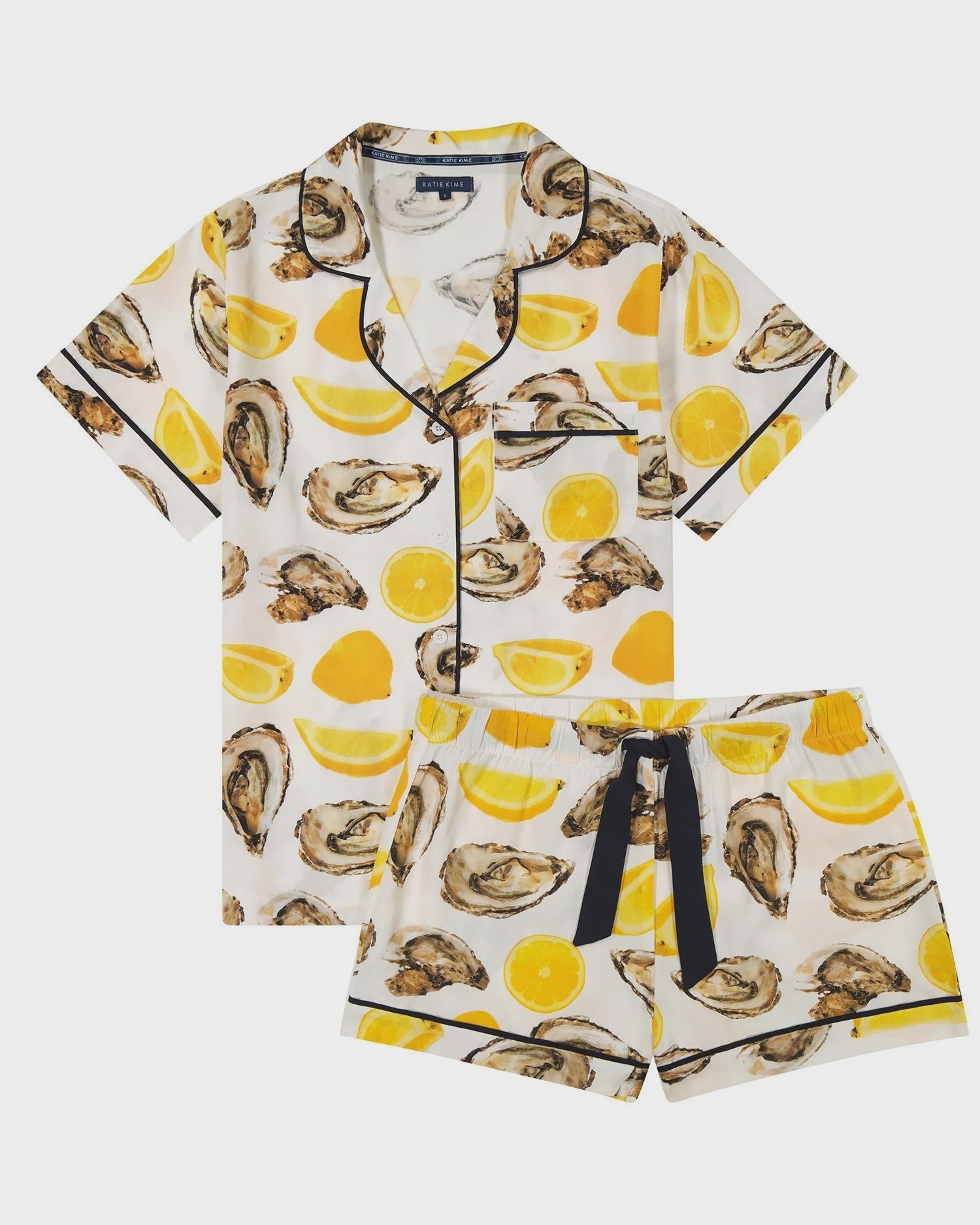 Our Women’s Pajama Shorts Set — is cut in a timeless silhouette with classic piping detail. The shorts’ elastic waist and adjustable ribbon tie ensure a custom, universally flattering fit. Add a bespoke touch with your choice of monogram.