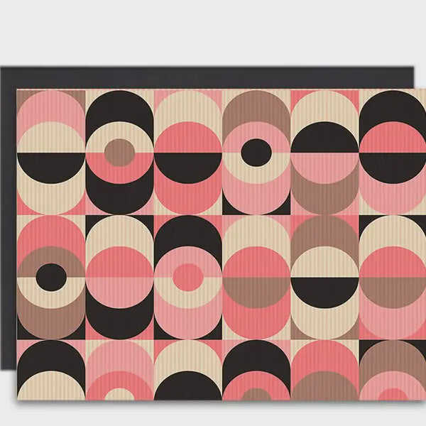 With a monochromatic pink palette and coordinating stripe backside, this Mid Century Modern design creates a bold statement in a folded notecard.