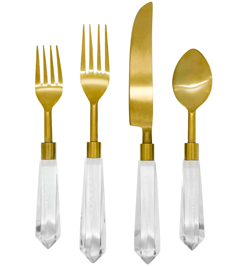 Put the silver away! Create a focal point on your table with this classic gold flatware combined with the modern twist of acrylic detailing. Setting the table is no longer a chore when your fork looks this lovely.